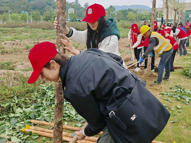 活动现场,学生们组成共青团先锋队,挥锹铲土、扶苗培根、提水浇灌,历时2小时完成百余株树苗栽种。身着青年志愿者红马甲的身影与嫩绿树苗交相辉映,构成春日里最动人的风景线。