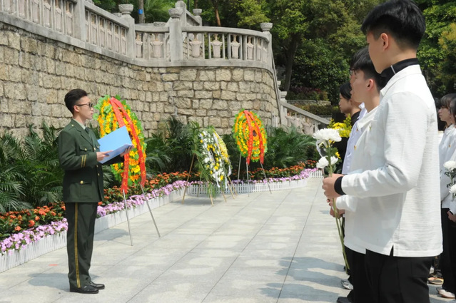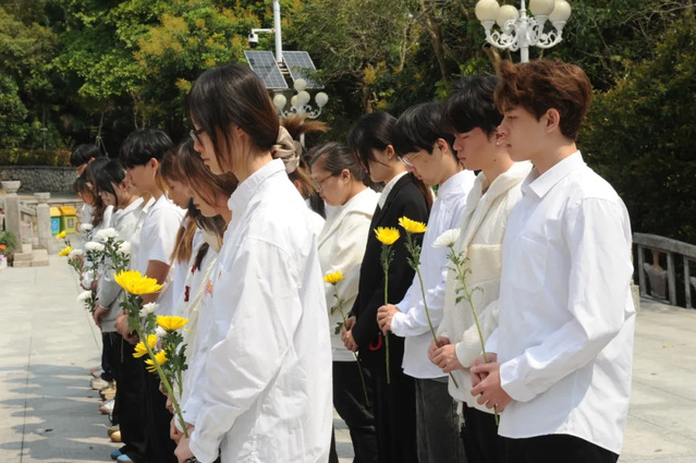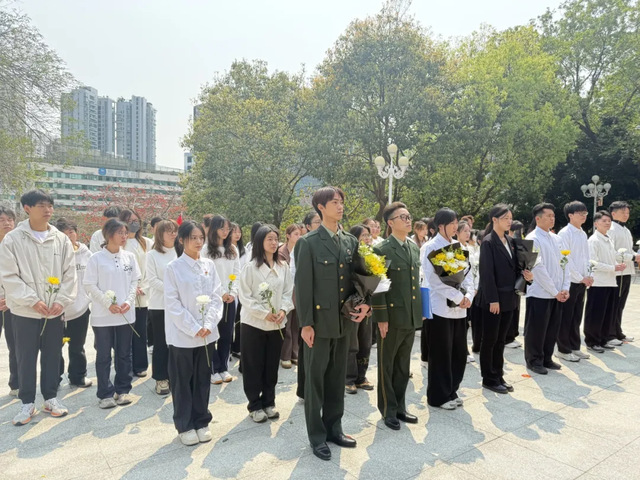 上午10时,烈士陵园内庄严肃穆。全体师生肃立默哀,向革命先烈致以最深切的缅怀与敬意。沉默中,师生们仿佛与历史对话,感受到先烈们为民族复兴付出的巨大牺牲。伴随着《献花曲》的悠扬旋律,师生代表缓步上前,向烈士纪念碑敬献花束。随后,全体人员依次瞻仰纪念碑并献花,每一朵鲜花都承载着对先烈无限的崇敬与追思。
