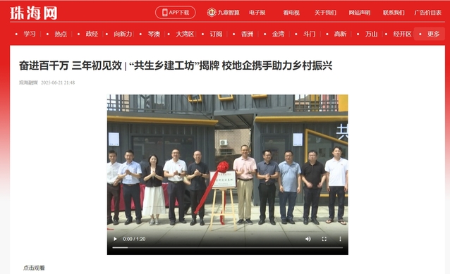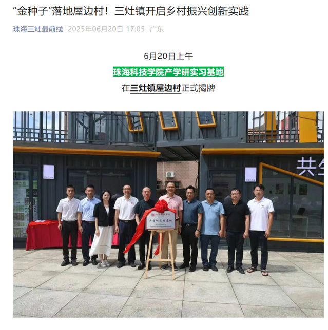 2025年6月20日上午,珠海科技学院产学研美术设计与建筑学院实习基地共生乡建工坊在三灶镇屋边村正式揭牌。该基地由珠海科技学院、三灶城资集团旗下珠海微渐安防科技有限公司与三灶镇政府三方共建,标志着高校智力、企业孵化与政府支持的深度聚合。